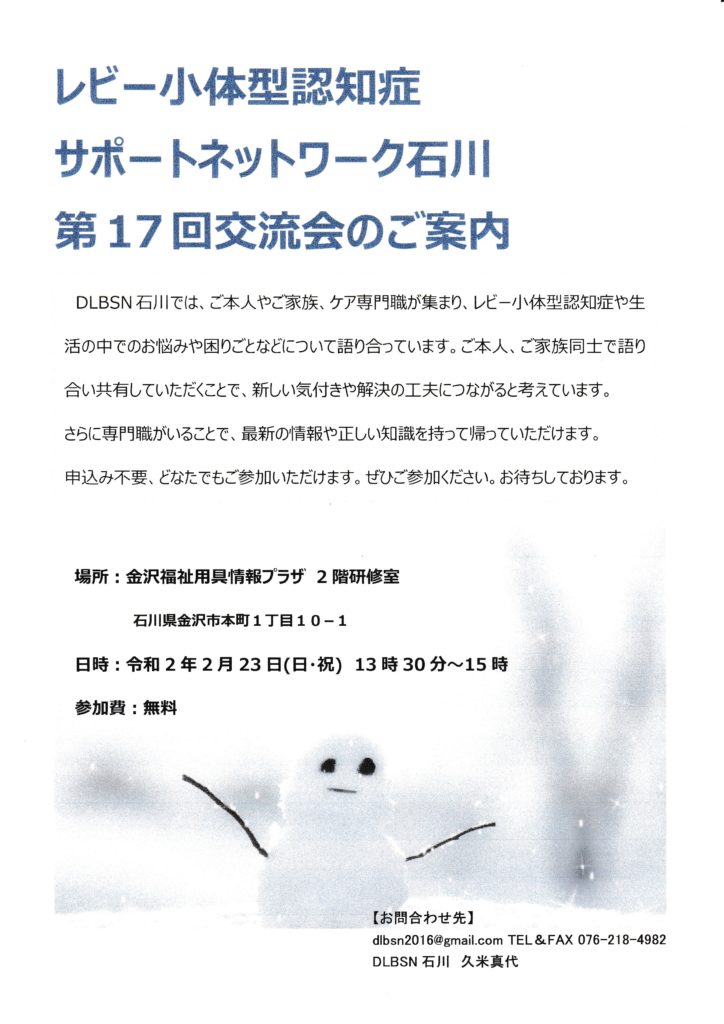 2020年2月13日 / 最終更新日時 : 2020年2月13日 pinknokujira お知らせ レビー小体型認知症サポートネットワーク石川(DLBSN)より交流会のご案内 認知症ケア専門士単位の付与はありません。