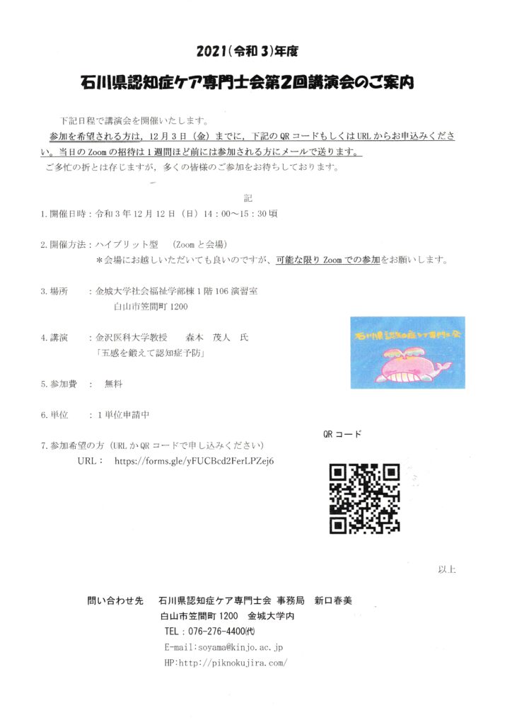 石川県認知症ケア専門士会では、令和3年12月12日(日)14:00~15:30頃の日程で第2回講演会を開催します。