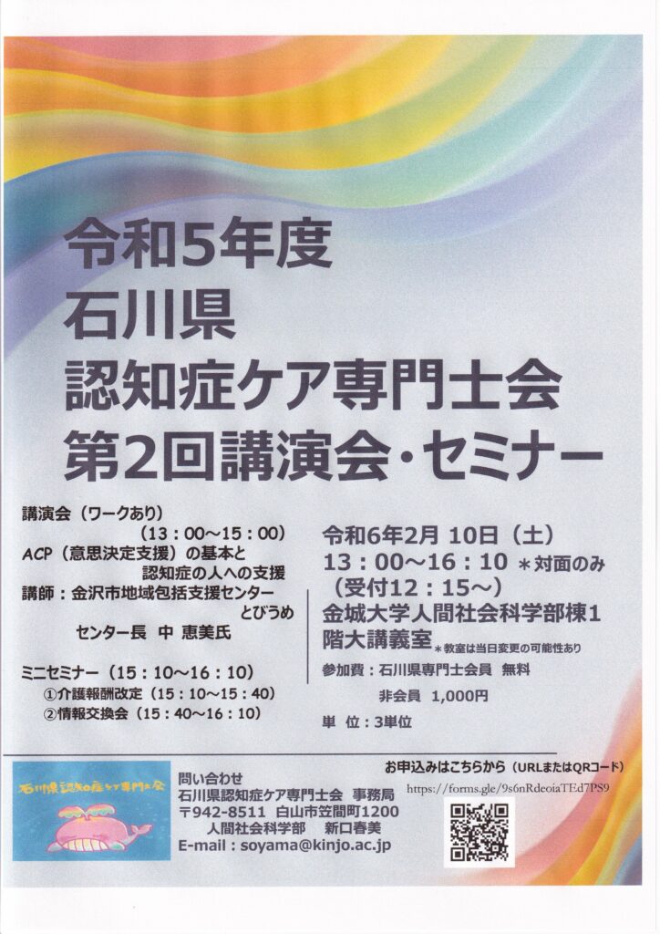 内容は「ACPの基本と認知症の人の支援」です。また、ミニセミナーも開催し、3時間の講演会となります。単位は現在申請中で3単位を予定しています。